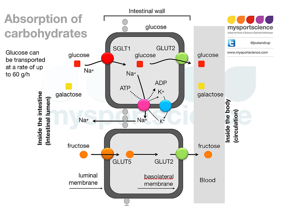 Consider multiple transportable sugars. Since the intestine can oxidize ~60 grams of glucose every hour, adding 30 grams of fructose allows for a total of 90 grams to be absorbed (remember: maximize the use of all doors lining the intestine).