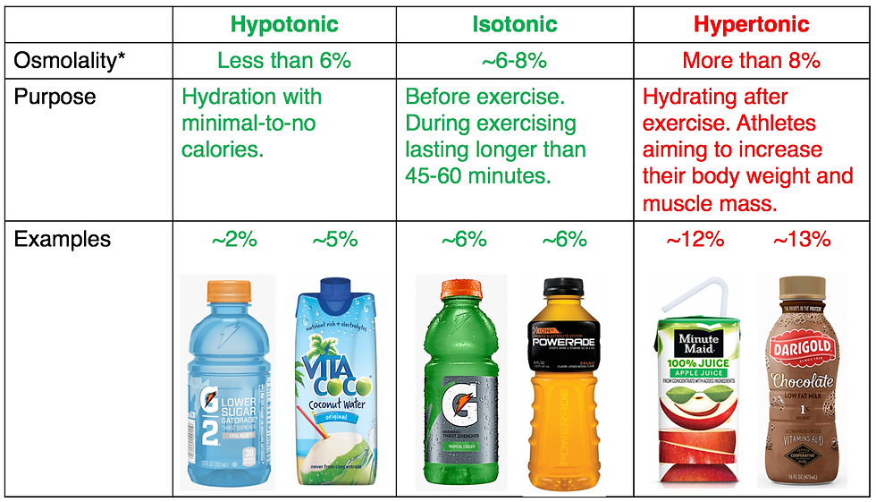 *To calculate osmolality, divide the grams of carbohydrate by the beverage portion in milliliters. For instance, a bottle (591 mL) of regular Gatorade contains 34 grams of carbohydrate. So (34/591)*100% = 5.8%.